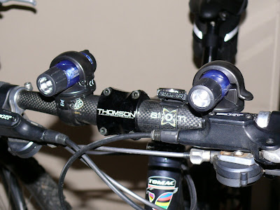 Depois de ter comprado a PowerLed da Sigma (um espectáculo), comprei 2 Ultra-Bright coloquei-as no guiador, a Powerled no capacete e tudo isto deu uma “alta central” para o mato.